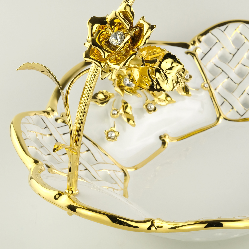 EMOZIONI Contenitore di monili piano con fiori 28×20 cm, ceramica, Colore Bianco, Decorazione oro, cristallo
