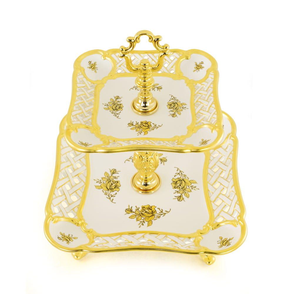 FIORI GOLD Openwork vassoio su gambe 23x23xh8 cm, ceramica, Colore bianco, decor oro