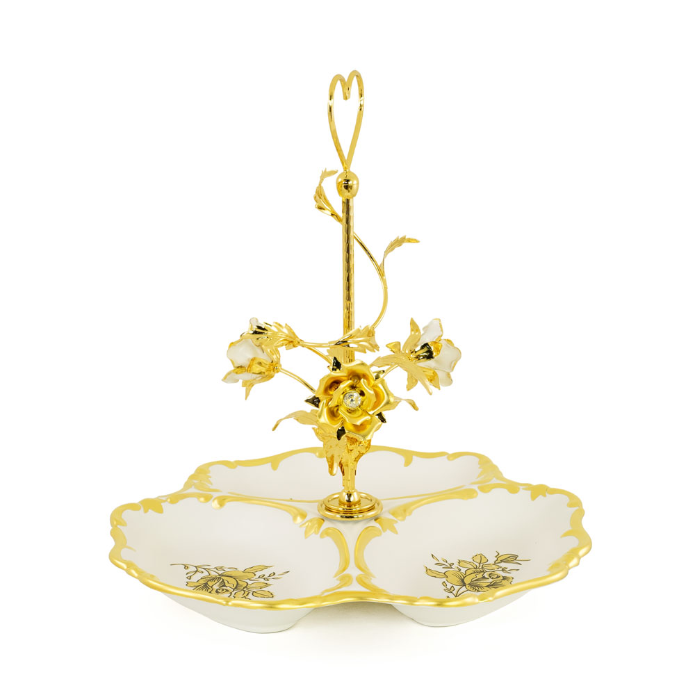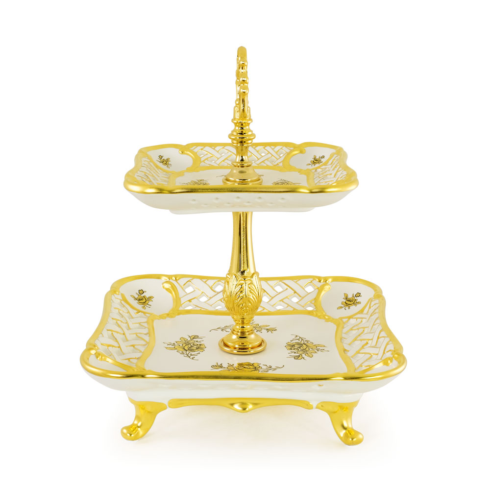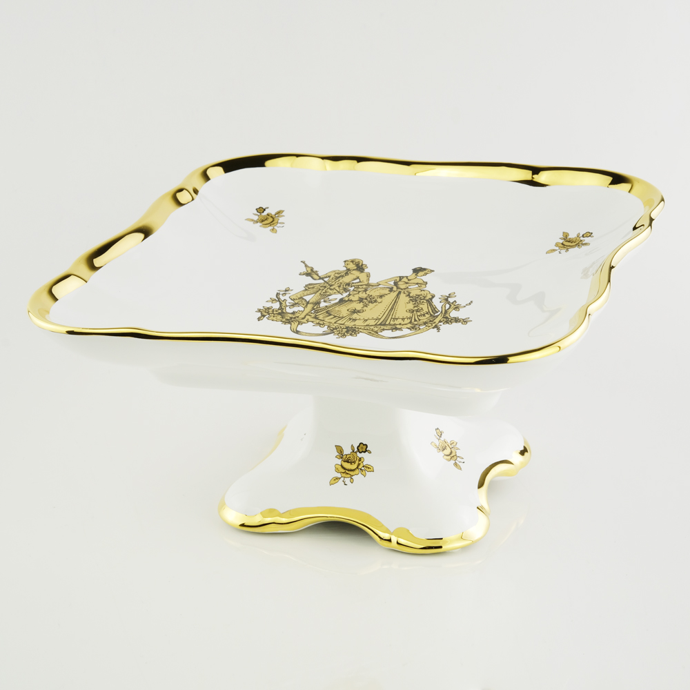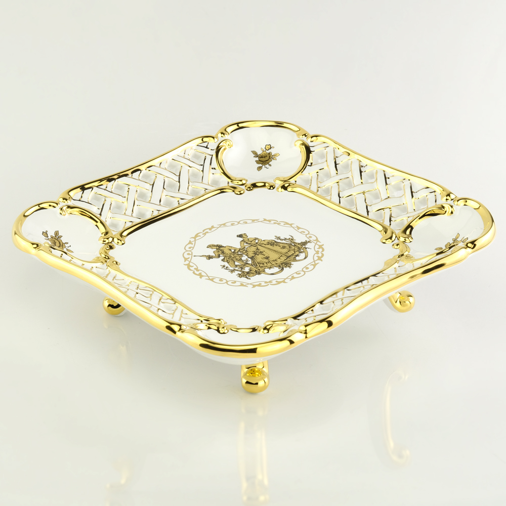 FIORI GOLD Openwork vassoio su gambe 23x23xh8 cm, ceramica, Colore bianco, decor oro