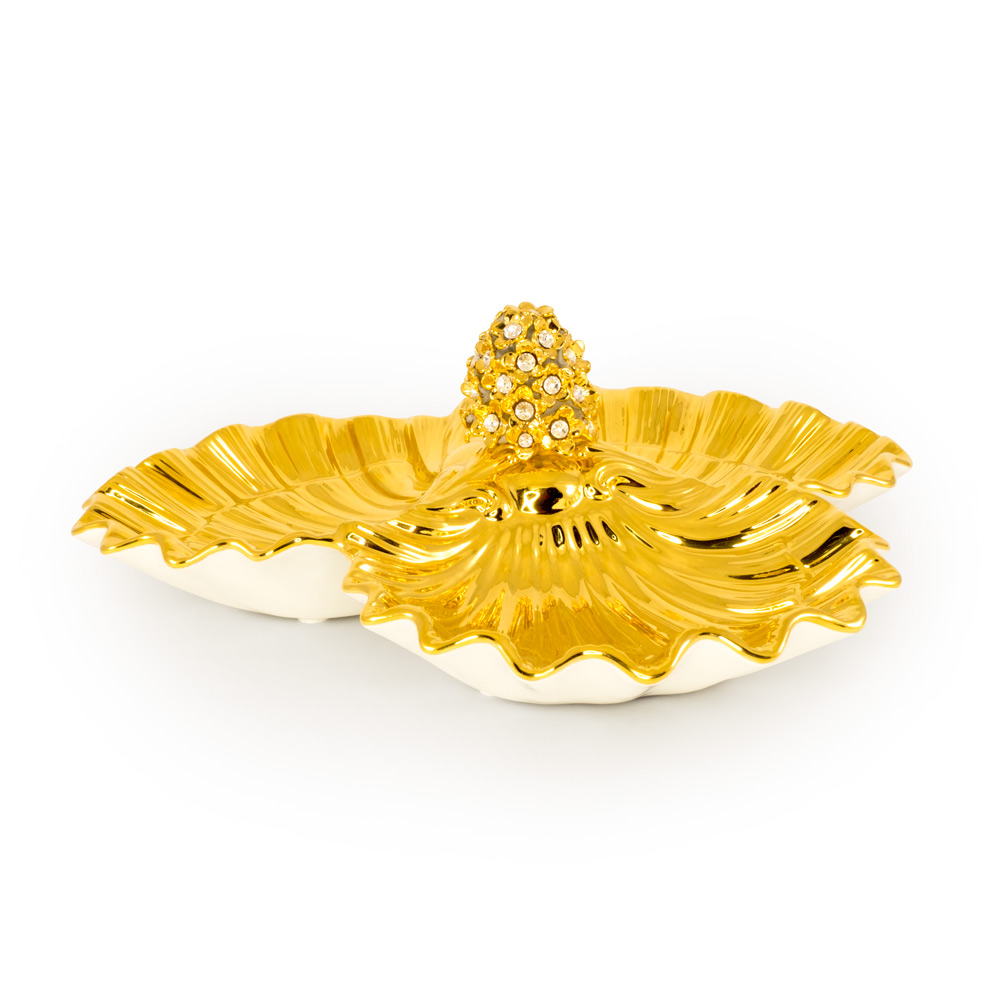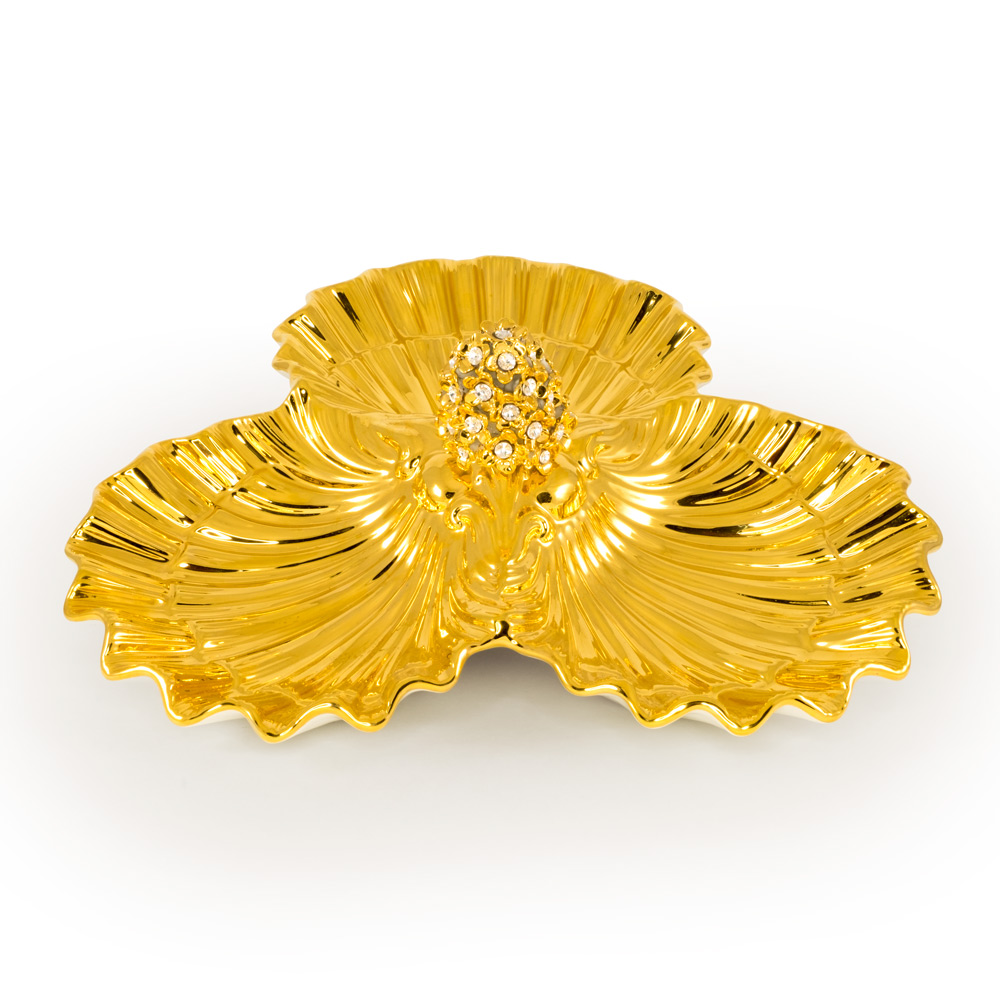 GIARDINO Conchiglia tripla con fiori D42 cm, ceramica, Colore Bianco, Decorazione oro, cristallo