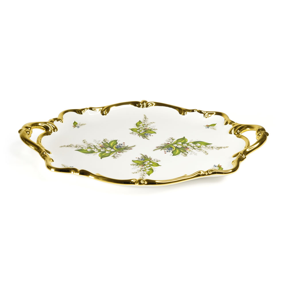PRIMAVERA Vassoio con manici 46x32xh6 cm, ceramica, Colore Bianco, Decorazione oro