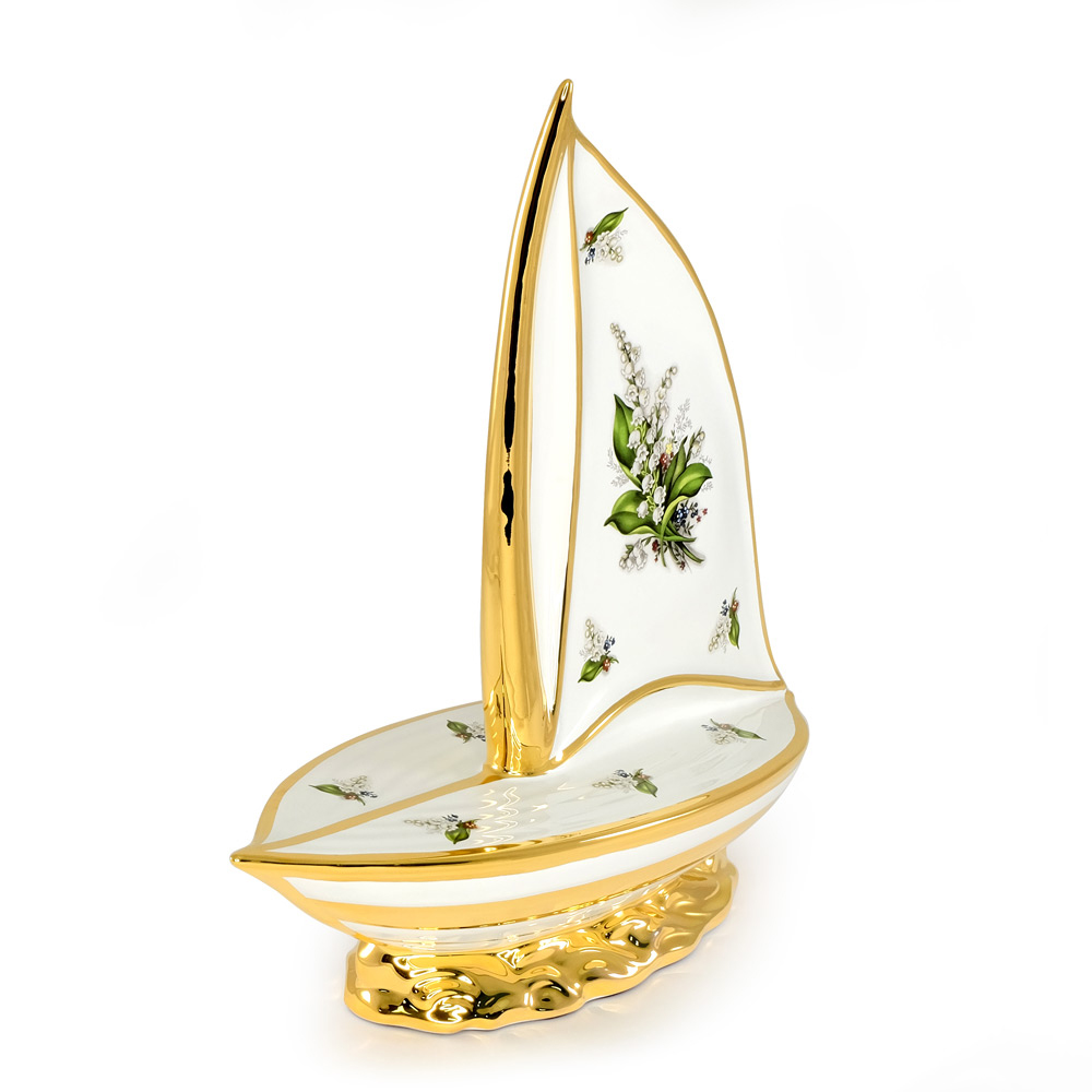 PRIMAVERA Piatto barca con vela 34x14xh36 cm, ceramica, Colore Bianco, Decorazione oro