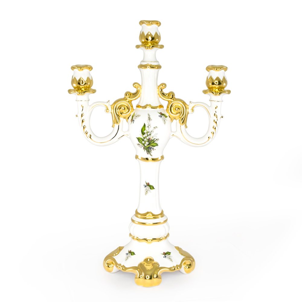 PRIMAVERA Portacandele per 3 candele 34x20xh53 cm, ceramica, Colore Bianco, Decorazione oro