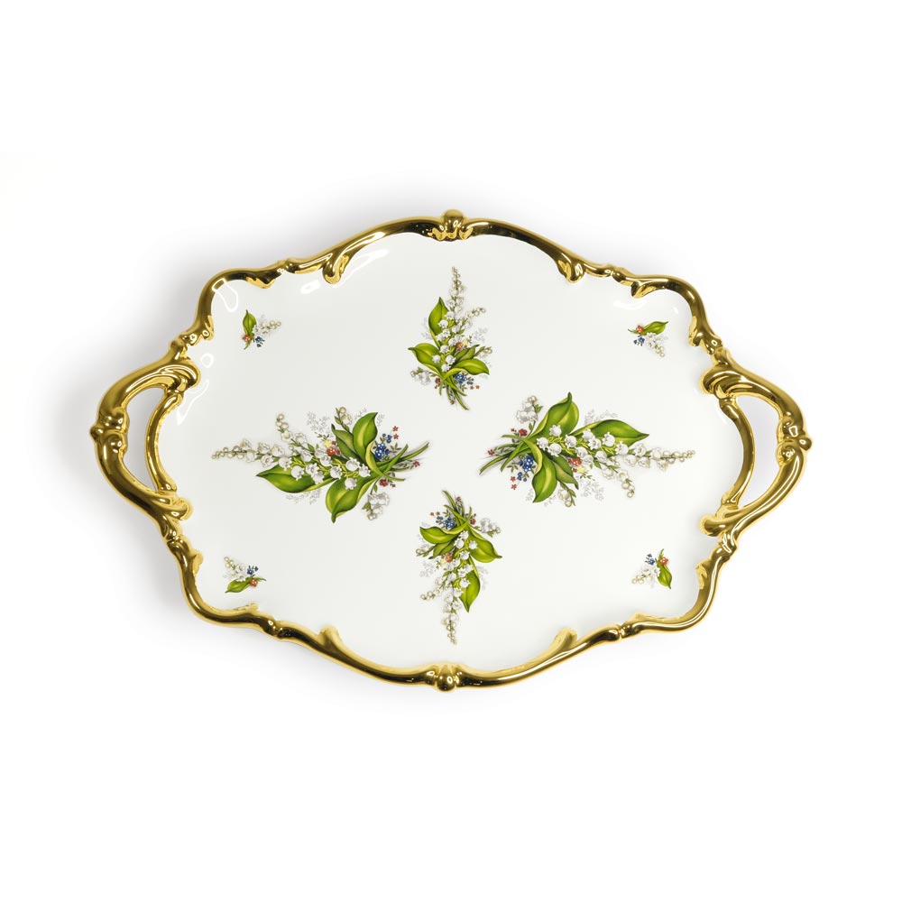 PRIMAVERA Vassoio con manici 46x32xh6 cm, ceramica, Colore Bianco, Decorazione oro
