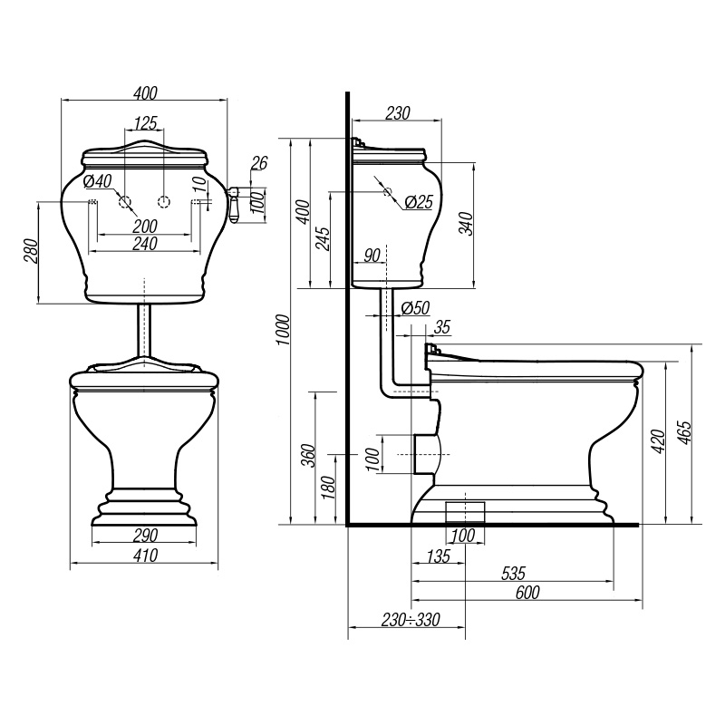 Vaso monoblocco con cassetta con leva discarico, Milady